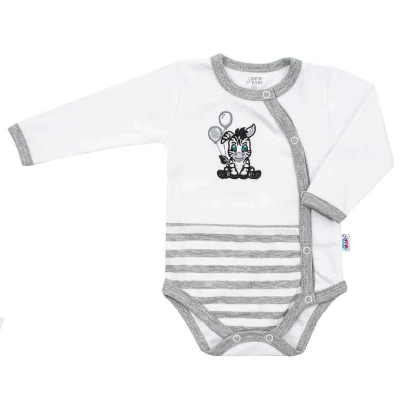Celorozopínacie bavlnené body New Baby Zebra exclusive pre bábätká. Body je ozdobené vyšitým obrázkom roztomilej zebry a spodná časť je celopotlačená pruhmi. Obrázok je podlepený látkou. Okolo krčku, nožičiek a ručičiek má sivé lemovanie. Moderné bočné zapínanie na ramienku a medzi nožičkami. Pre bábätká je dôležitým kúskom oblečenia a pri akomkoľvek pohybe je chrbátik bábätka stále prikrytý.