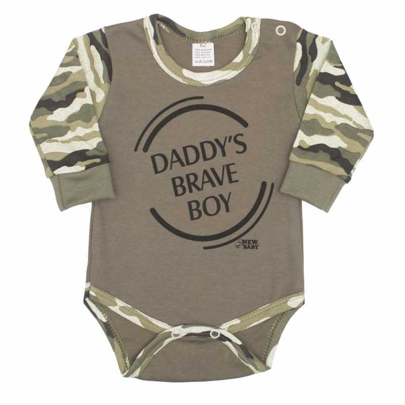 Dojčenské body s dlhým rukávom New Baby Army pre bábätká. Detské body je zdobené maskáčovým vzorom a nápisom DADDY'S BRAVE BOY. Okolo krčku, nožičiek a ručičiek je lemovanie s maskáčovým vzorom. Na ručičkách je pružný lem, ktorý netlačí a uľahčí obliekanie. Naše body je roztomilé a zároveň štýlové. Praktické zapínanie na cvočky na ramienku a medzi nožičkami.