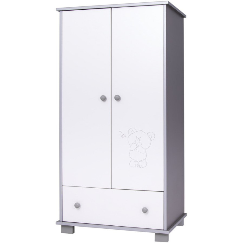 Dřevěná dětská šatní skříň Drewex s veselým obrázkem medvídka a motýlka, vyrobená z kvalitního borovicového dřeva. Ve spodní části je objemný šuplík. Rozměry: cca 160x83x48 cm.