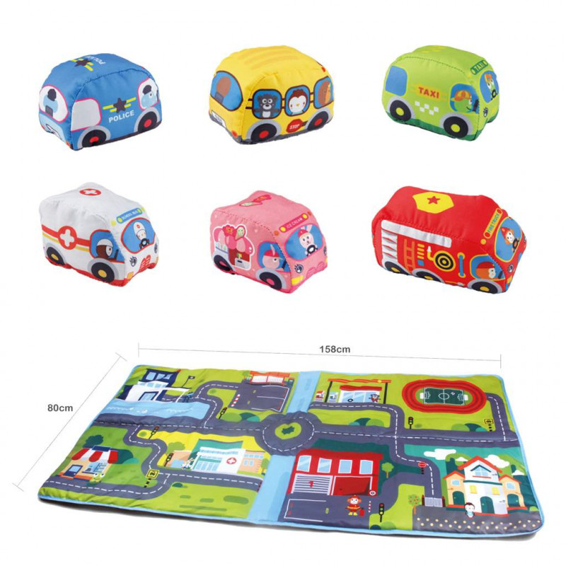 Kobereček na hraní Bayo je nádherný kobereček s motivem města s nádherně vykreslenými cestami, semafomy, kruhovým objezdem a budovami. Kobereček doplňuje 6 měkkých polštářkových autíček - požárníci, policie, autobus, ....
