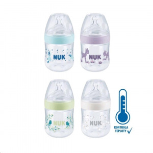 Kojenecká láhev Nuk Nature Sense S-small 150 ml s indikátorem teploty. Zabudovaný indikátor kontroly teploty změní barvu, pokud je obsah láhve příliš horký. Modrá barva indikátoru se změní na bílou. Lahvička miminkům usnadňuje přechod od kojení nebo krmení k samostatnému pití.