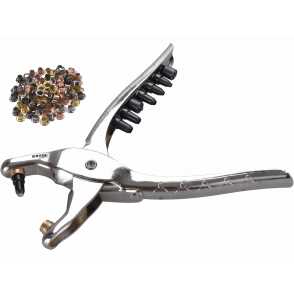 délka 225mm, stříhání otvorů pr.2,5-3-3,5-4-4,5-5mm, nýtování kovových průchodek 4mm, 100ks kovových průchodek (25x stříbrná, 25x zlatá, 25x měděná, 25x černá)