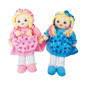 Textilní panenka 40 cm ve žluté, zelené a růžové barvě šatů. Cena je za kus.