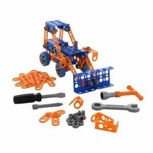 Stavebnice Mladý inženýr traktor nakladač č. 1, balení je 27 cm velké, obsahuje 141 ks různých stavebních částí, které děti spojují pomocí šroubů a matic, čímž rozvíjejí jemnou motoriku a kreativitu.