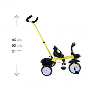 Dětská šlapací tříkolka s rukojetí Axel je určena pro děti ve věku od 1 do 3 let. Je vyrobena z kvalitních a odolných materiálů. Má pohodlné a ergonomicky tvarované sedátko, kde vzdálenost k řídítkům lze snadno nastavit a tím přizpůsobit tříkolku věku a výšce dítěte. Tříkolka patří k produktům skupiny GROW UP, tedy roste s dítětem. Na předním kole lze uvolnit náhon na pedály a pomocí vodicí tyče tlačit malého závodníka, když mu dojdou síly. Široká kola vyrobená z tvrzené pěny EVA, zaručí pohodlí a odolnost na každém povrchu. Do dvou praktických košíků si váš malý závodník naskládá všechny potřebné hračky a může vyrazit vstříc dobrodružstvím. Kombinace kovové konstrukce a součástek vyrobených z nejkvalitnějších materiálů zaručuje odolnost za všech podmínek. Pro maximální bezpečí dítěte má tříkolka tříbodové bezpečnostní pásy.