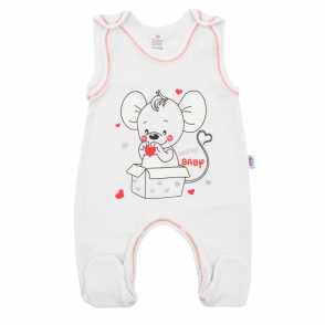 Dojčenské dupačky New Baby Mouse. Dupačky sú zdobené farebným lemovaním a veľkým obrázkom myšky. Zapínanie na cvočky na ramienku a medzi nožičkami. Majú veľmi príjemný a kvalitný materiál.
