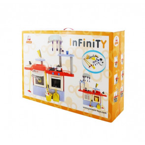 Kuchynka Infinity Premium je balená v krabici 87 x 60 cm veľkej. Pozostáva s kuchynskej časti a časti s práčkou, umývadlom a žehliacim pultíkom. obe často môžeme použiť aj samostatne. V balení sú aj všetky vyobrazené doplnky. Kuchynka je 100 cm vysoká s pracovnou doskou vo výške cca 50 cm.