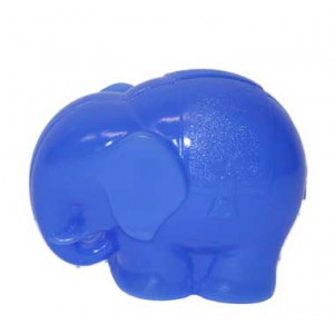 Pokladnička sloník z plastu, v modrej alebo zelenej farbe.