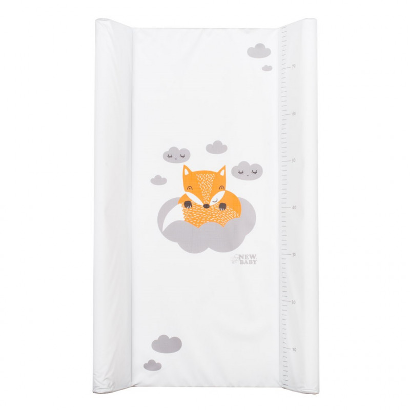 Praktická tvarovaná prebaľovacia podložka New Baby z nepremokavého, plastového materiálu s obrázkom líšky a obláčikov. Podložka má vyvýšené bočné strany a možno ju použiť na komode či inom mieste na prebaľovanie.